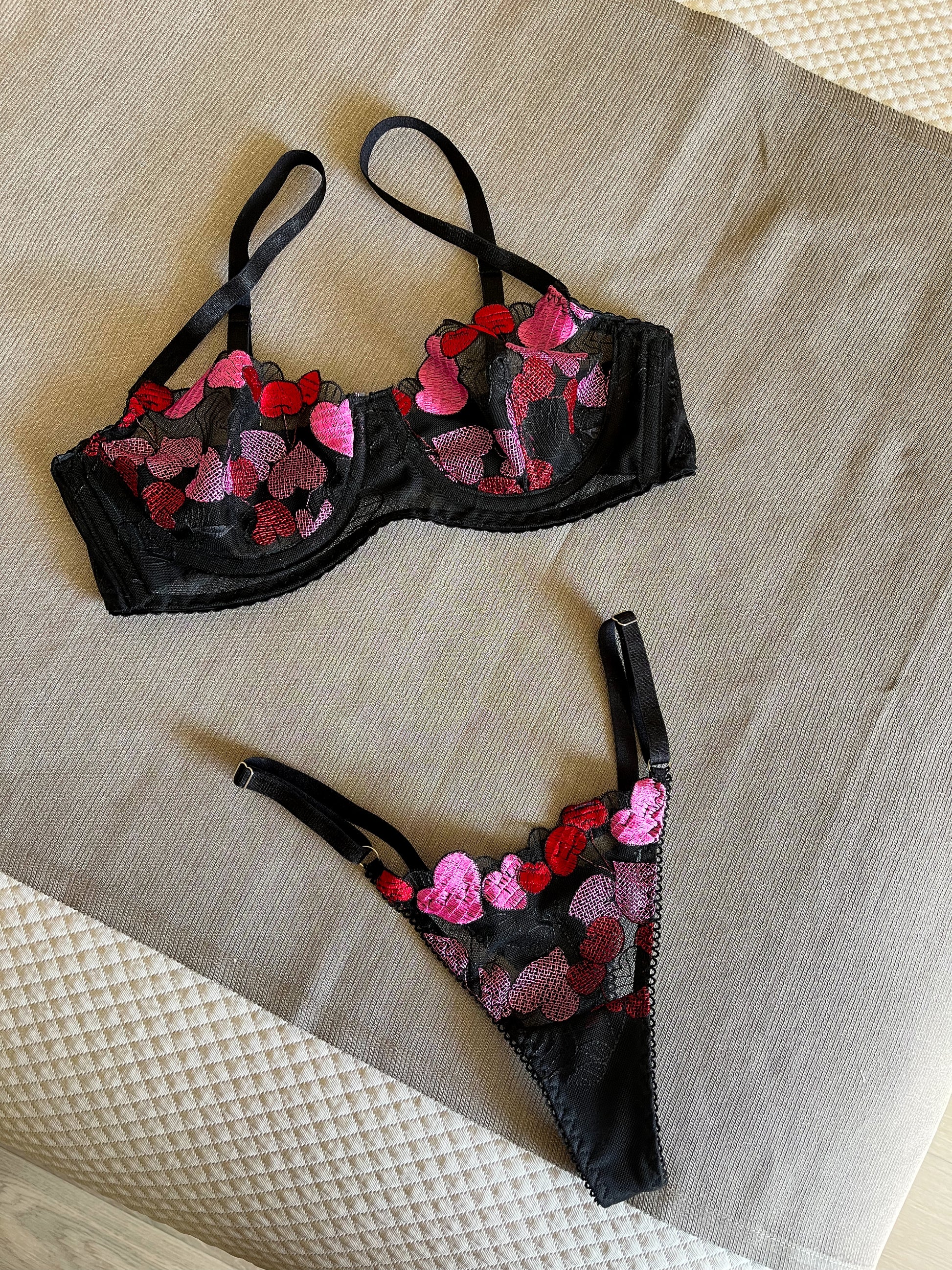 Conjunto romântico e feminino. Com renda bordada e malha elástica para mais conforto e elasticidade. O conjunto inclui sutiã e cuecas. Cuecas fio dental com alças ajustáveis.