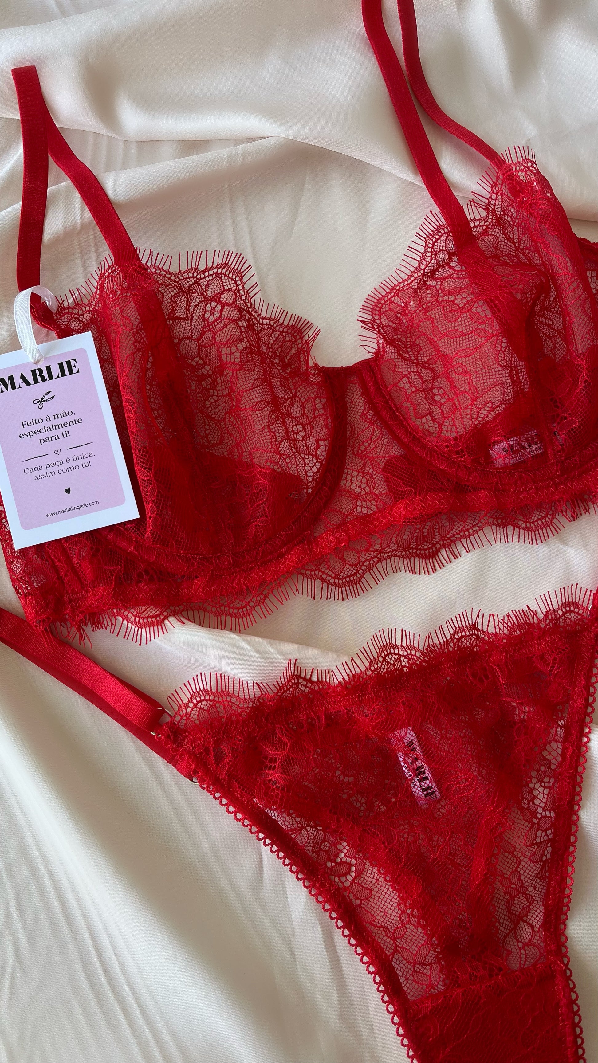 Conjunto sexy e delicado com uma bela renda de chantilly. Sutiã clássico e confortável. Cuecas em formato de fio dental com alçadas ajustáveis ou brasileiras.