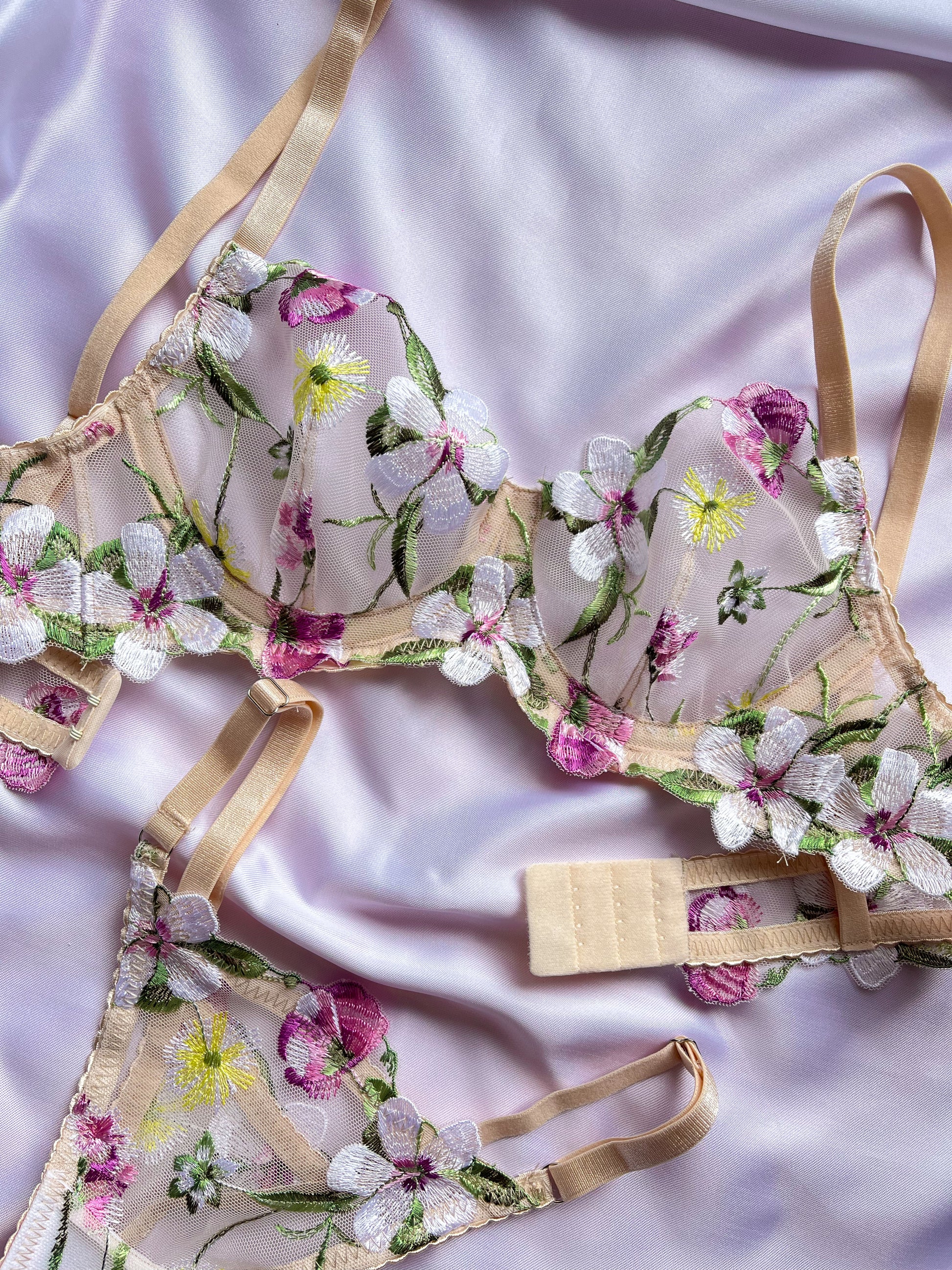 Conjunto delicado, feminino e elegante com cores vibrantes. Renda bordada floral que transmite feminilidade. O conjunto inclui sutiã e cuecas. Sutiã clássico e confortável. Cuecas com alças ajustáveis, que permitem alterar o tamanho.